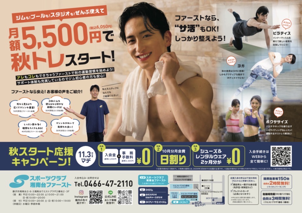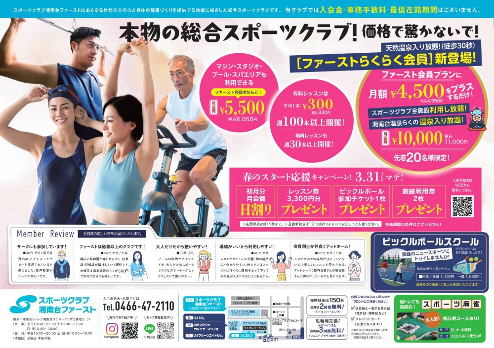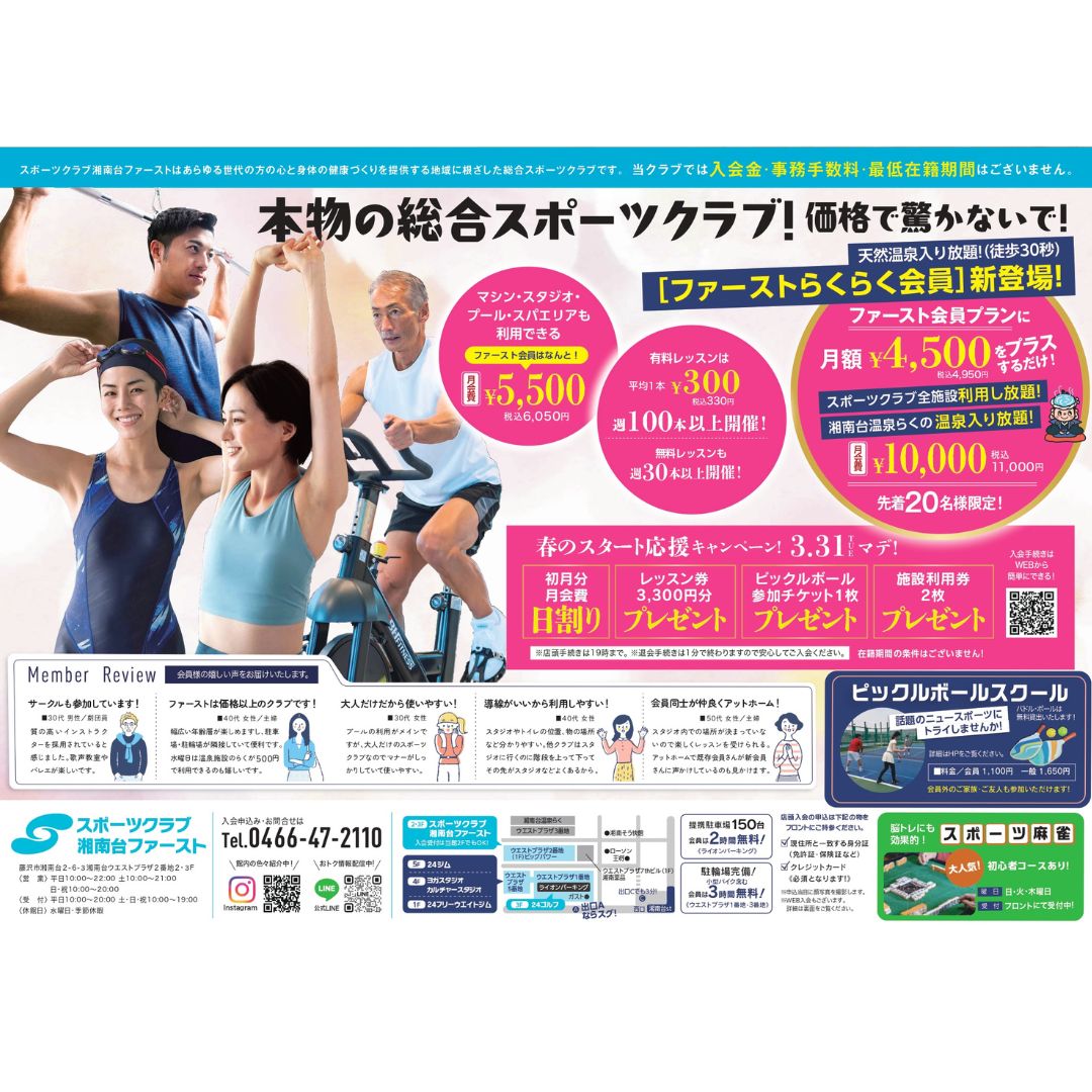 期間限定の「再入会キャンペーン」を実施いたします! キャンペーンの詳細はこちらから【再入会のご案内】 ご不明な点はクラブまでお問合せください。 《問い合わせ先》湘南台ファースト TEL:0466-47-2110(受付時間:10:00-20:00)